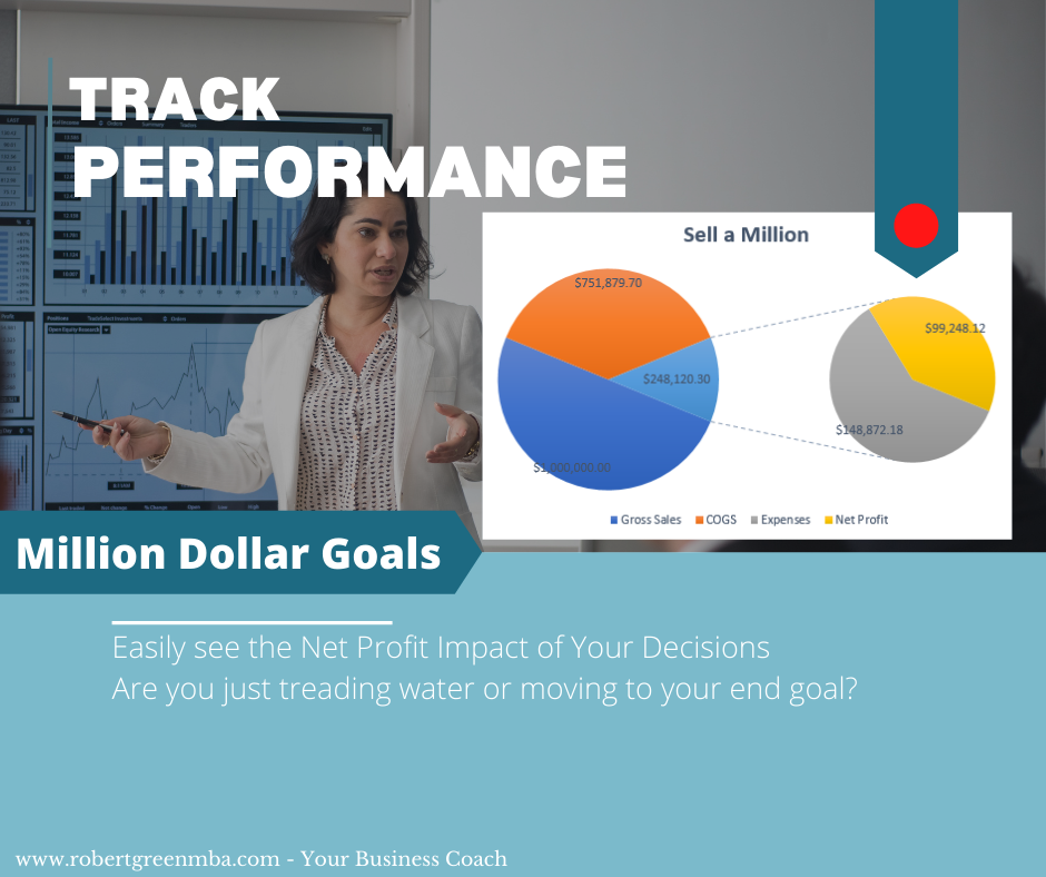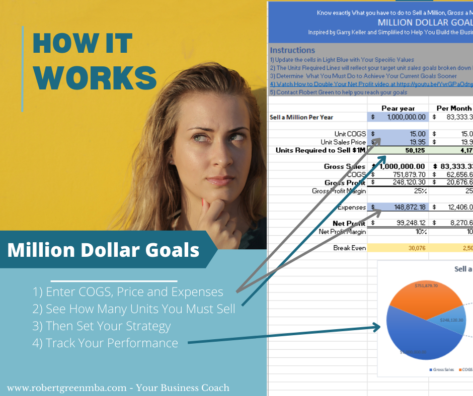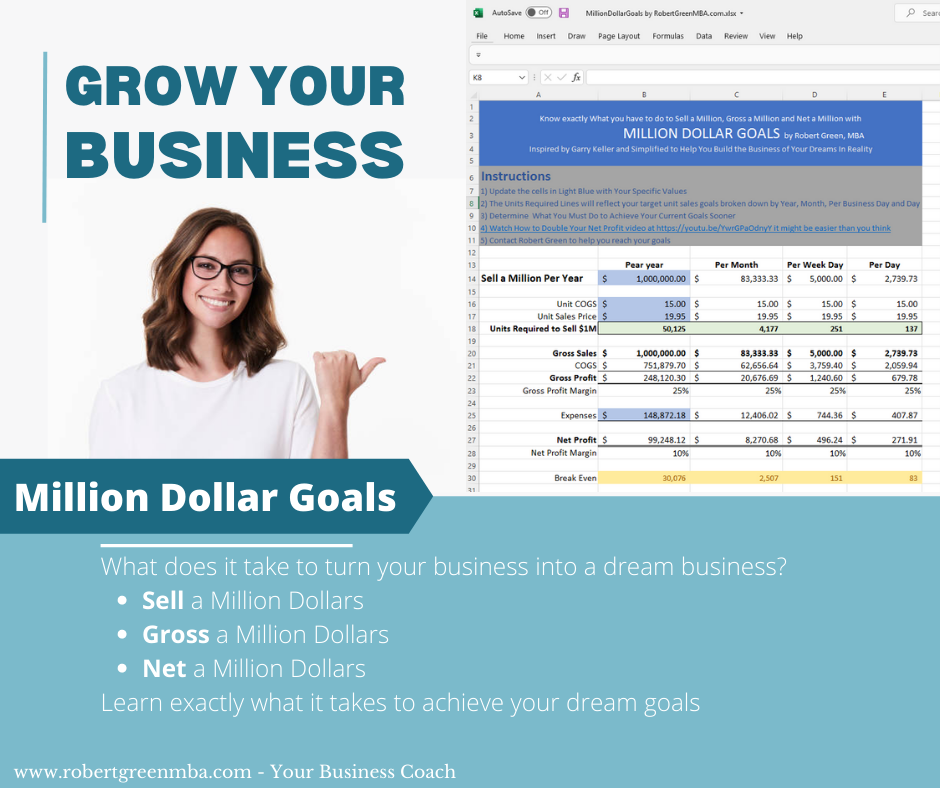 With the MillionDollarGoals Spreadsheet, you will know exactly what it takes to Sell a Million dollars of your products or services, Gross a million dollars and Net a million dollars and learn exactly how many units you need to sell per year, month, business day or each day.